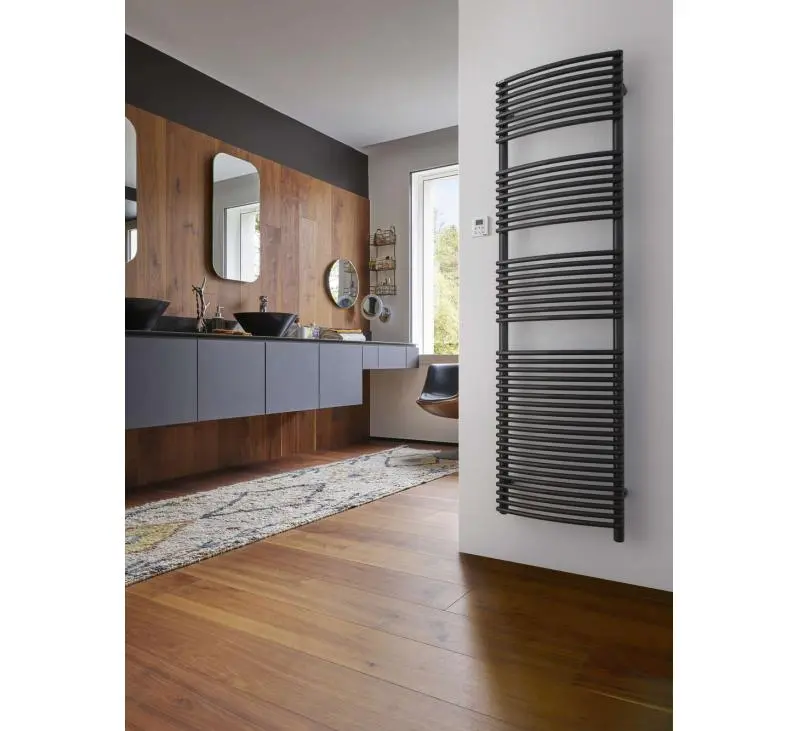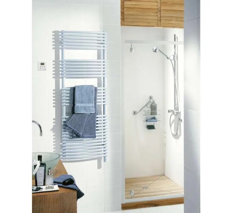 Confort optimal : Profitez d’une chaleur douce et homogène qui réchauffe agréablement votre salle de bain et sèche vos serviettes en un clin d’œil. Son design cintré facilite la pose des serviettes et offre une expérience unique.